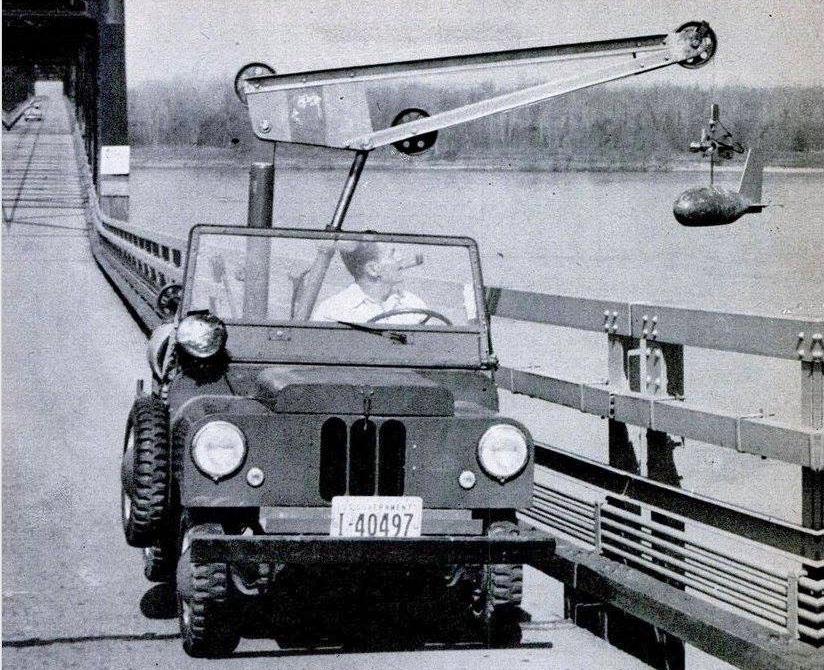 This rig was built by the U.S. Geological Survey department to measure river currents on the Mississippi River. They chose the FarmOroad because it was small enough to go on sidewalk of many bridges. They used the rear PTO to raise and lower the equipment and a manual hydraulic jack to adjust the boom angle. |