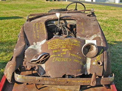 Paul Gorrell (Iowa) calls it "Rusty" it had the number one position of the Spotlight class in 2011. This is the prototype of all VCs to come, the very first Hotshot. Paul walked by it going to school sitting at the local Crosley dealer. He tried to buy it for years as he saw it rusting away beside the closed dealership. Even a wall of the building fell on it. He had to wait till the estate sale after the dealer died to buy it. To restore it would mean replacing everything that made it the first Hotshot. So he mounted #1 to a trailer and showed it the way he bought it back in the 80s. It has notes painted all over pointing out differences from the production Hotshot. |